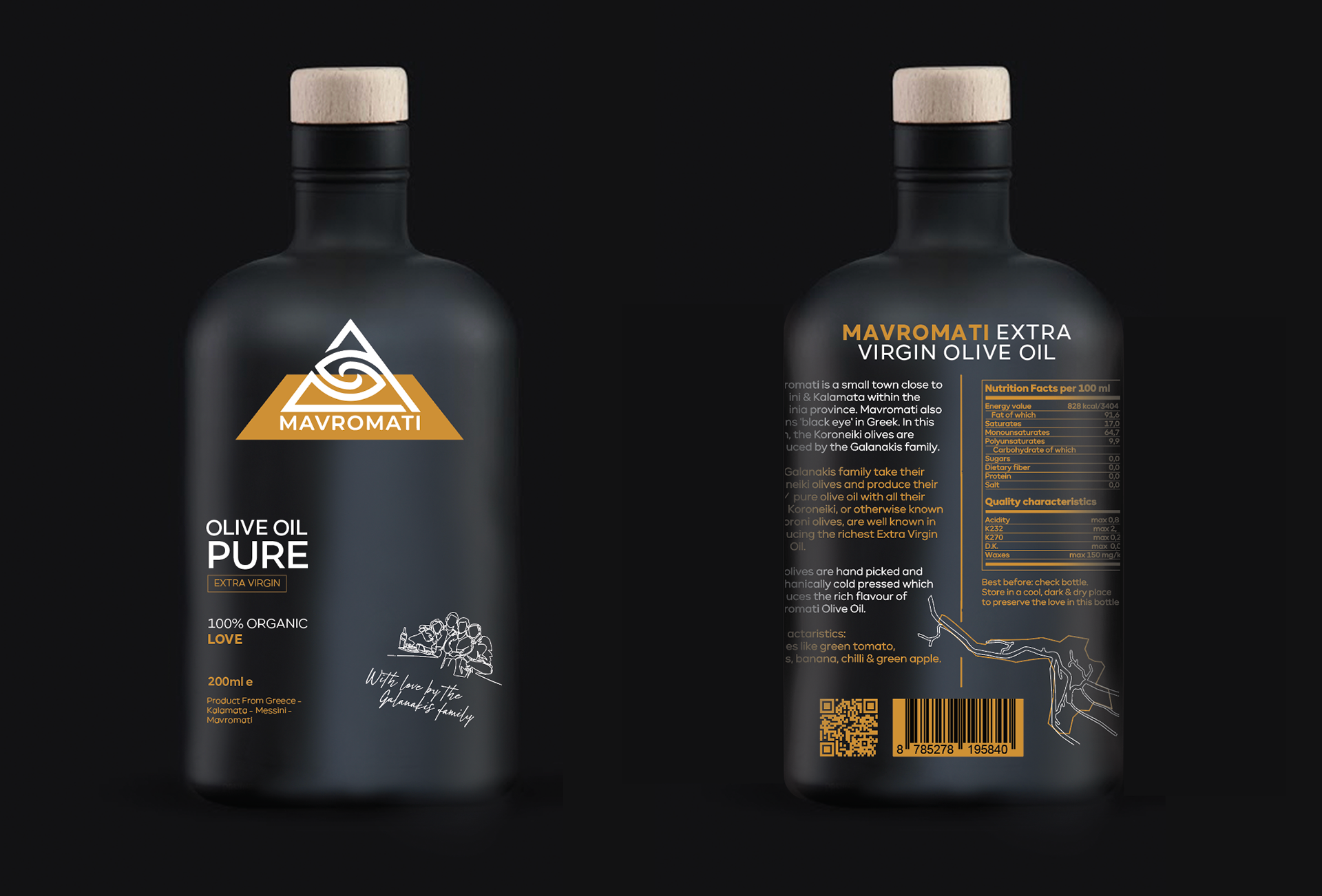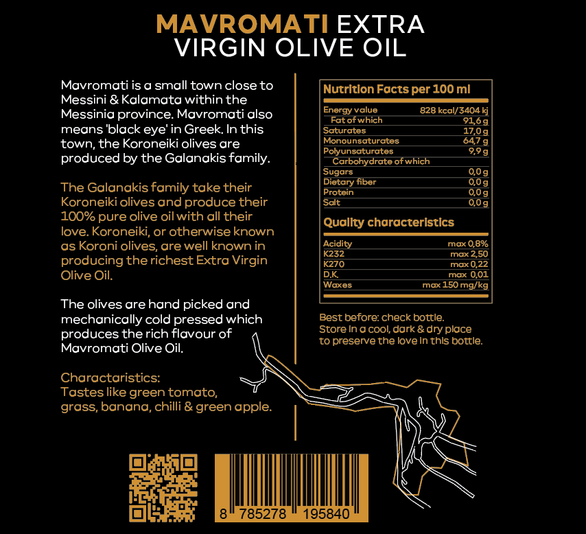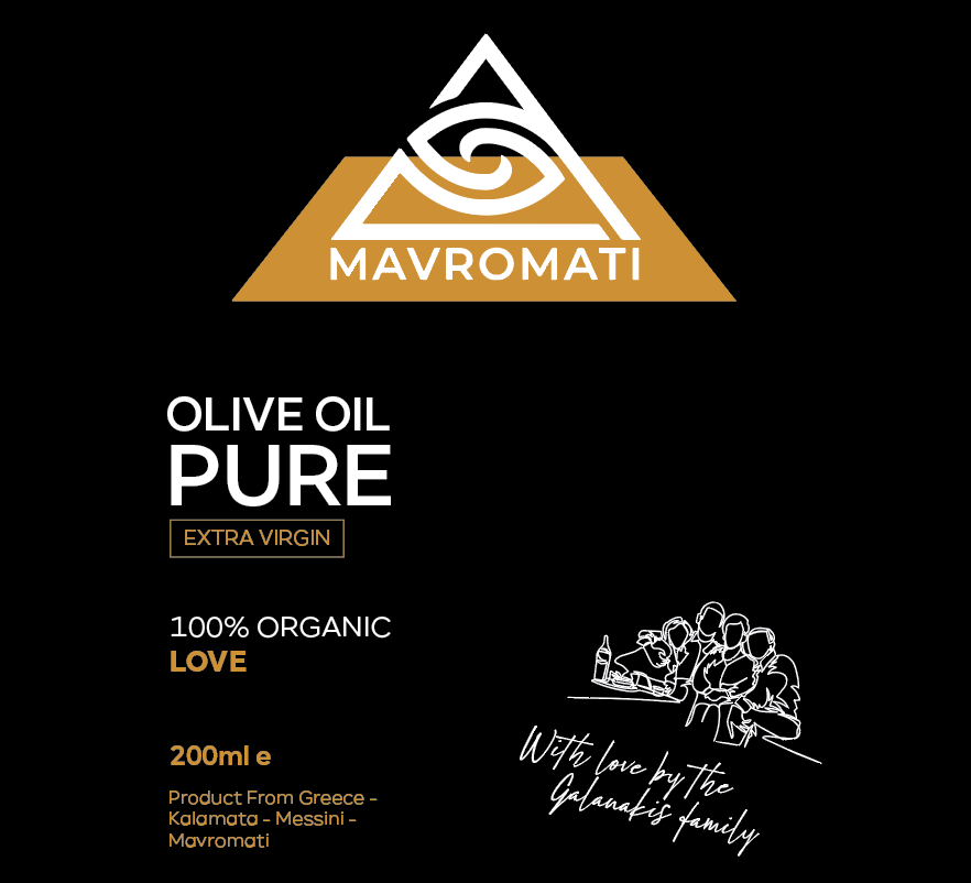 Etiketten voor het olijfolie merk Mavromati met als belangrijkste kernwaarde: premium, familie en handmade with love!